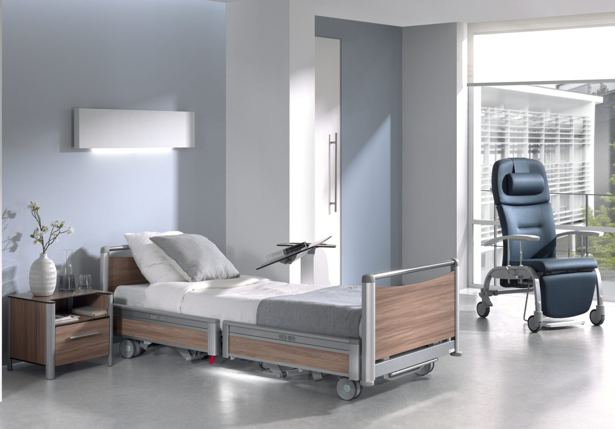 Otro ejemplo de cama articulada para hospital de altas prestaciones a la vez que elegante y funcional es la Olympia Hospital. Esta cama dispone de diferentes opciones de equipamiento hospitalario.