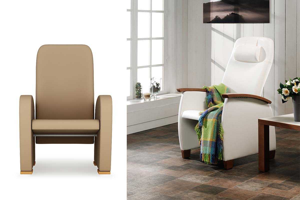 Sillón asistencial relax de estilo doméstico con reposabrazos anchos tapizados (±12 cm) y estructura de madera maciza de haya. Mecanismo Classic de empuje (push-back) con 3 posiciones — sentado, lectura y relax — sin necesidad de manipular palancas. Pensado para residencias, centros geriátricos y domicilios particulares donde se busca el confort asistencial con la calidez de un mueble de salón.