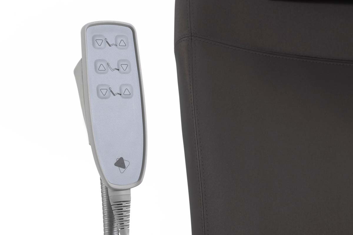 Fero E-move está equipada con un reposapiernas y un respaldo ajustables eléctricamente, fáciles de manejar con un mando intuitivo. Dos actuadores se encargan de que el respaldo, el asiento y el reposapiernas se inclinen hasta una posición de gravedad cero (*). El respaldo y el asiento son ajustables individualmente.