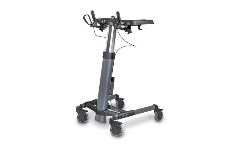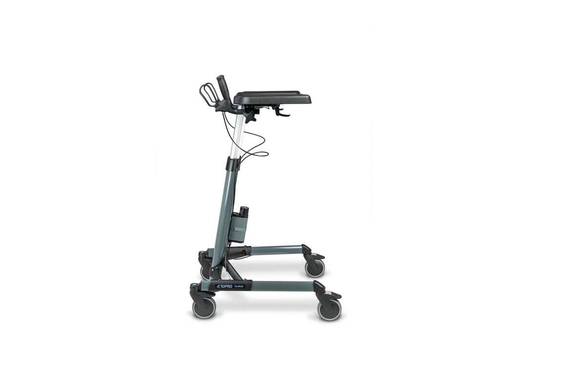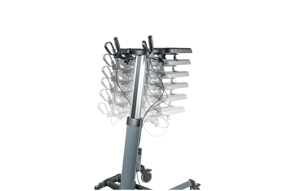 Andador Taurus E Premium de 4 ruedas, frenos tipo maneta, apoyo en antebrazos, sistema eléctrico de ajuste de la altura, regulable en aducción, abducción y rotación del apoyo de antrebrazos y mango de agarre. Bloqueo de las ruedas y bloqueo direccional de las ruedas.